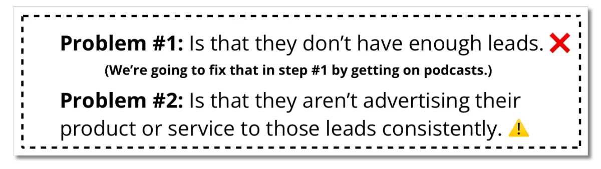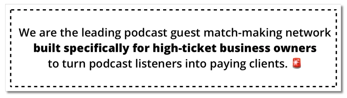 help you get booked on 2 x top podcasts every week (100 podcasts in the next 12 months) — We help our clients get booked on hyper-specific podcasts where their ideal clients are actually spending time...