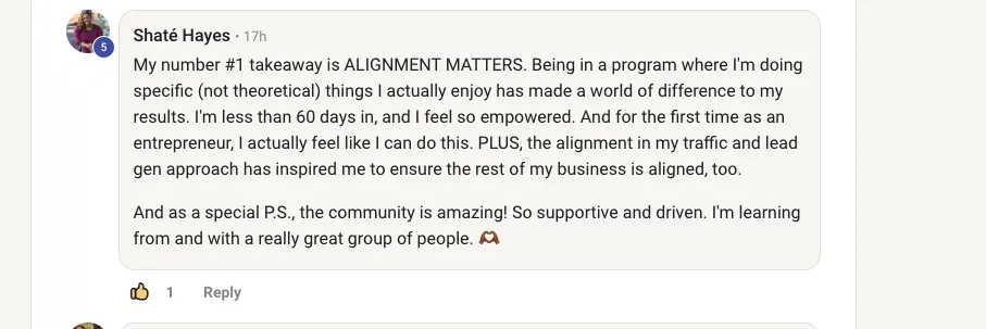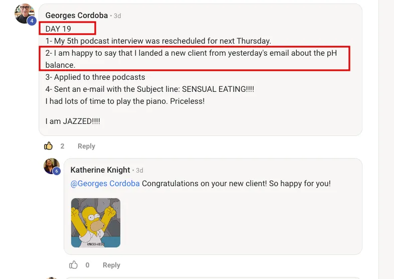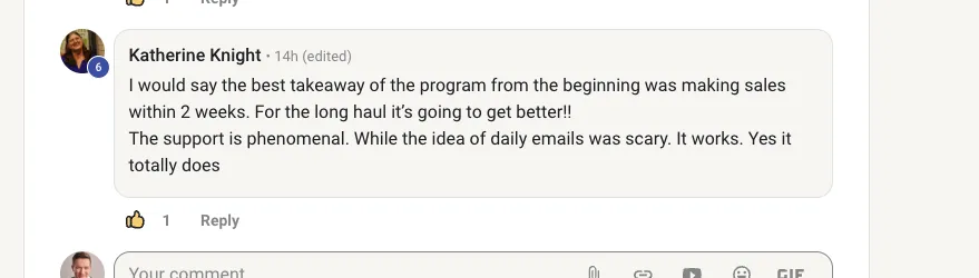 "I'm somewhere in month two now, but figured this was a good place to post an update. Around Day 8, I had a good conversation one of the group calls with Jamie Atkinson and Chris Toto. After that, I stepped back and made some changes to our model and messaging, and we did a healthy five figures in sales shortly after that call."